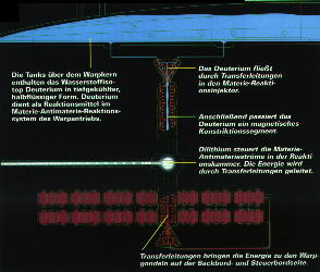 Das Herz des Warptriebwerks ist der Warpkern - dort wird ebenso viel Energie erzeugt und kontolliert wie im Innern der Sonne. Materie und Antimaterie regieren aufeinander und erzeugen die für den überlichtschnellen Flug durchs All erforderliche Energie.