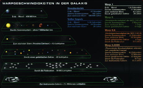 Im Jahre 1969 brauchten bemannte Raumkapseln drei Tage um den Mond zu erreichen. Mit Höchstgeschwindigkeit braucht ein Raumschiff für die gleiche Strecke nur 5,38 Sekunden. Mit Warp 7, 656-facher Lichtgeschwindigkeit, dauert die Reise zum nächsten Stern, Proxima Centauri, drei Tage. Mit Warp 1 hingegen, also Lichtgeschwindigkeit, würde sie fast fünf Jahre dauern.