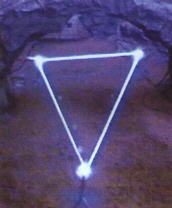 Im aktivierten Zustand sind die Strukturverstärker durch blaue Energiestrahlen miteinander verbunden. Was sich im Innern dieses Dreiecks befindet kann sicher gebeamt werden.