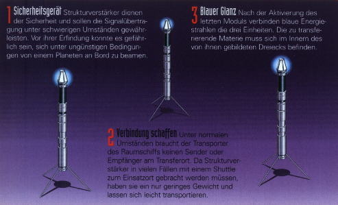 Der Strukturverstärker verstärkt das molekulare Muster eines Objekts oder einer Lebensform, so daß sich der Transferfokus leichter und besser ausrichten läßt. Normalerweise setzt man solche Geräte ein um Interferrenzen zu überwinden, die von elektromagnetischer Abschirmung stammen oder von natürlichen Phänomenen hervorgerufen werden. Das Verstärkungssystem besteht aus drei zylinderförmigen, etwa einen Meter langen Apparaten. Sie sind silberfarben und haben am oberen Ende einen transparenten Konus, der im aktivierten Zustand leuchtet. Eine Taste im mittleren Abschnitt lässt unten drei Beine ausfahren, die den Strukturverstärker auch auf unebenen Grund senkrecht halten.