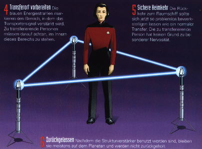 In diesem Fall werden die blauen Strahlen der energetischen Verbindung nicht automatisch beim Einschalten der drei Module aktiviert. Die Aktivierung erfolgt vielmehr von der Transporterkonsole aus. Angeblich ist tatsächlich die Ausrichtung des Transferfokus möglich, nach der Verstärkung des ringförmigen Sperrstrahls. Allerdings stellt sich der ganze Vorgang als Holografische Simulation heraus - es ist unwahrscheinlich, daß sich so etwas wirklich realisieren läßt.